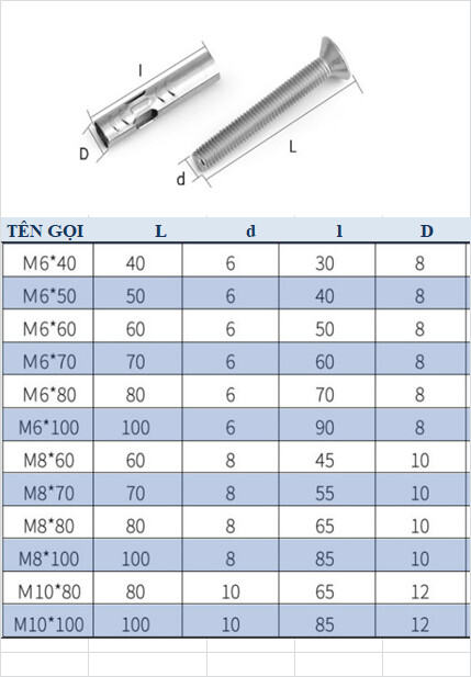 Mục đíchDùng cố định vật dụng thiết kế có lỗ khoan vào nền bê-tông như: liên kết giá đỡ khung kim loại, treo tường, tấm lót phẳng, cơ khí, thép góc cạnh, hệ thống chiếu sáng,…
